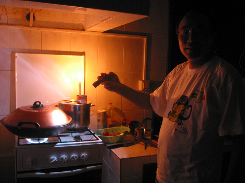 時間過得很快,五點半後的聖多美,慢慢的天色漸暗,大概在六點多後,就近入了漆黑的夜晚,不過不知道是哪裡出了問題,遲遲抓不出原因,最後我們只好宣布,今天是我們的燭光晚宴。史醫師點著蠟燭,拿著手電筒仍在廚房裡忙著張羅晚餐,而我們則在黃色微光室內中,聽著亭君姐的吉他民謠,而我們的晚餐也就「爛漫」的在燭光中度過。