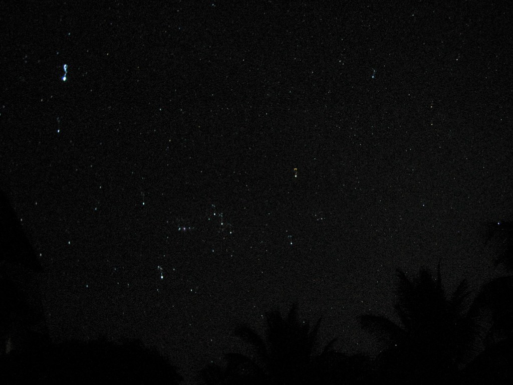 漆黑的天空,點綴的星星,在沒有人工燈光威脅下,總算得以發揮所長,獵戶座,大熊座的北斗七星,雙子座,全天最亮的天狼星,金牛座都逐漸在黑色布暮上,爭先恐後的輪番上陣表演。還記得高中的時候,對於滿天的星斗都可以如數家珍的指名道姓,可惜到現在除了幾個大戶人家外,我已經似曾相識,但卻說不出個仔細,不過那種滿天繁星所帶來的驚奇和感動,卻還是依然熟悉。