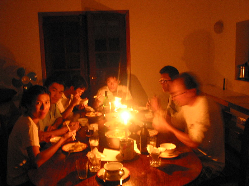 時間過得很快,五點半後的聖多美,慢慢的天色漸暗,大概在六點多後,就近入了漆黑的夜晚,不過不知道是哪裡出了問題,遲遲抓不出原因,最後我們只好宣布,今天是我們的燭光晚宴。史醫師點著蠟燭,拿著手電筒仍在廚房裡忙著張羅晚餐,而我們則在黃色微光室內中,聽著亭君姐的吉他民謠,而我們的晚餐也就「爛漫」的在燭光中度過。