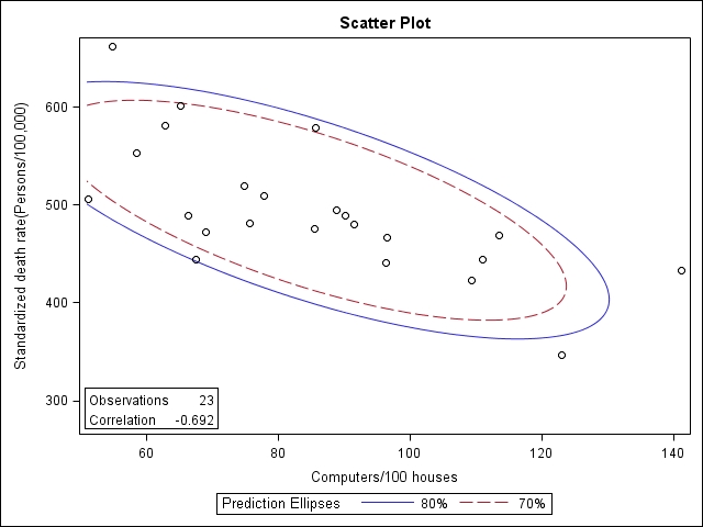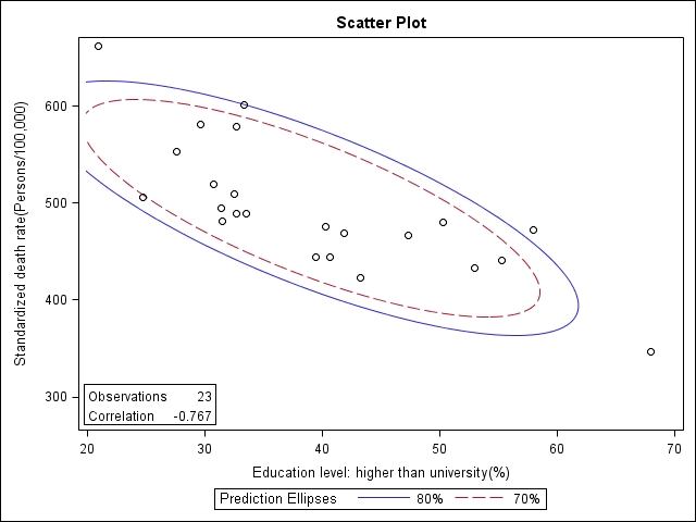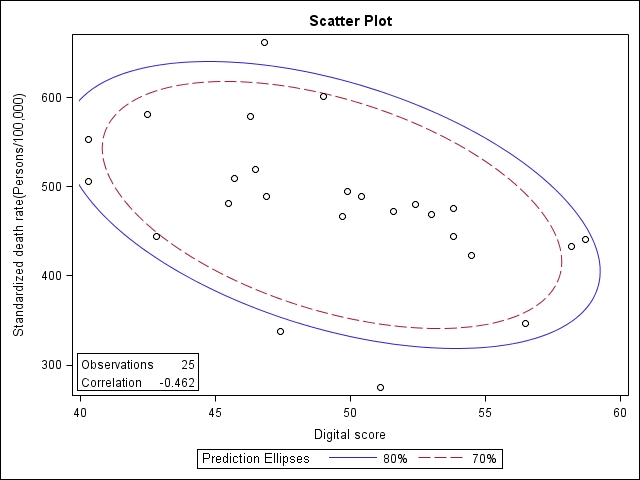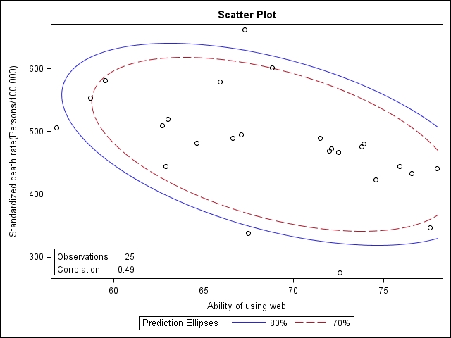 使用軟體SAS 9.2,以Pearson correlation分析各縣市標準化死亡率各自與教育程度指標:「 就業者之教育程度結構-大專及以上(%);醫療資源指標:「 平均每一執業醫師服務之人口數(人/人)」;數位落差的指標:代表量(quantity)的「家庭現代化設備(每百戶擁有數)-家用電腦(臺) 」、「會電腦」、「會網路」的比率和代表質(quality)的「個人整體數位表現分數」的相關係數。