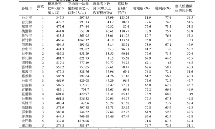 標準化死亡率來自衛生署的民國98年的各縣市死因統計資料。然後在《中華民國統計資料網》中的各縣市重要指標查詢系統中,以「 就業者之教育程度結構-大專及以上(%)」代表各縣市的人力資源素質與教育程度;以「 平均每一執業醫師服務之人口數(人/人)」 代表各縣市的醫療資源;「家庭現代化設備(每百戶擁有數)-家用電腦(臺) 」代表各家庭數位落差的「量(quantity)」,然後再跟研考會「 歷年數位落差調查報告」中,收集「 98年個人家戶數位落差調查報告」,分別以各縣市中的「會電腦」、「會網路」的比率(%)代表數位落差的「量(quantity)」;以「個人整體數位表現分數」代表個人數位落差的「質」。個人整體數位表現包含四個構面:公民行為、生活應用、Web 2.0和資訊收集,每個構面又各自包含不同的指標。